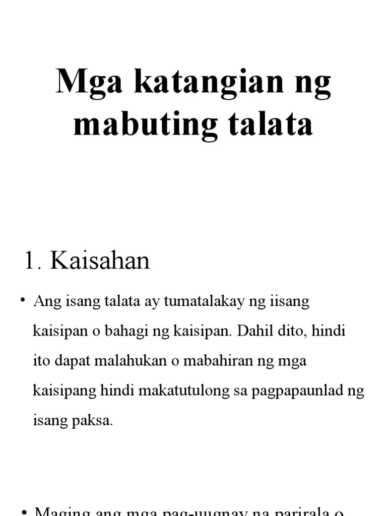 Kaisahan Ang isang talata ay tumatalakay ng iisang kaisipan o bahagi ng kaisipan. Learn vocabulary terms and more with flashcards games and other study tools. Talatang Pabuod madalas na ito ang pangwakas na talata o mga talata ng komposisyon.