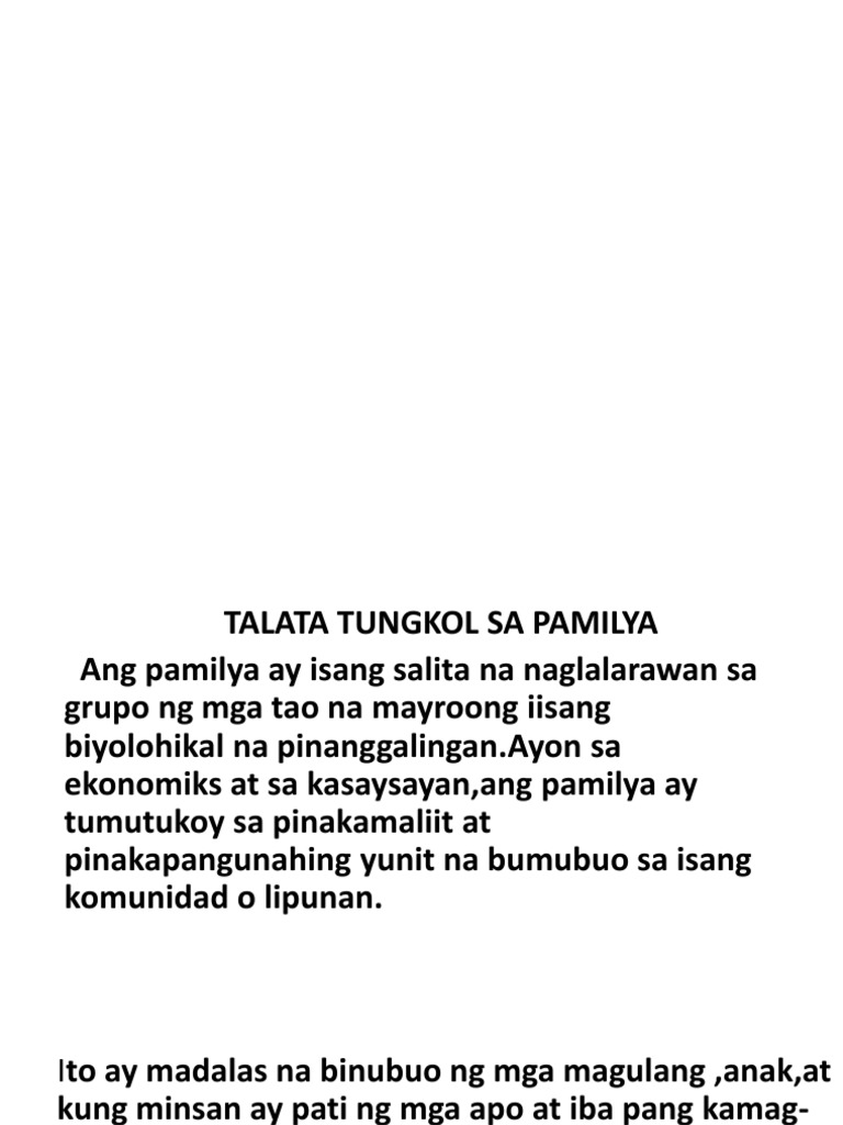 Talata tungkol sa pamilya Ang pamilya ay isang salita na naglalarawan sa grupo ng mga tao na mayroong iisang biyolohikal na pinanggalingan. January 3rd 2021 - Panimulang Talata ito ay magsimulang nalalaman o nagkaroon ng punto na may kinalaman sa paksa at kung saan ito patungo Talatang Ganap ito naman ay ikinabit ng mga puntong nagtutulak sa pangunahing diwa para mas lalong maintindihan ng mambabasa Talatang Paglilipat Diwa ito ay sinasama o kinukuha ang mga nasabi nang ideya sa mga nauna. Iniimpluwensiyahan nito ang kanilang pang-araw-araw na kaisipan at kilos.