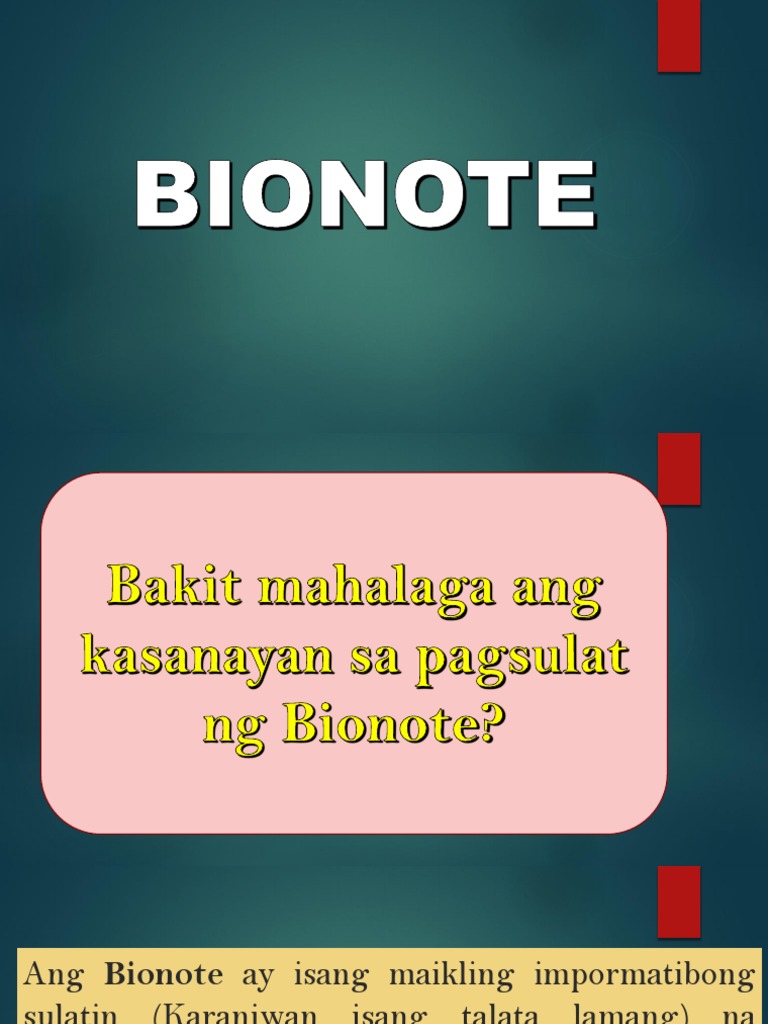 Maikli ito karaniwang 10 ng haba ng buong papel at isang talata lamang. BIONOTE Ang bionote ay naglalaman ng. Ang Bionote ay isang maikling impormatibong sulatin Karaniwan isang talata lamang na naglalahad ng mga klasipikasyon ng isang indibwal at.