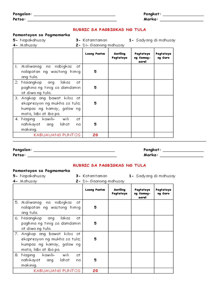 5963 82 Peradeniya Road Kandy. Makatulong sa pagmarka ng pagsasadula ng maikling kwento by sheryle-21. _____ RUBRIC SA PAGBIGKAS NG TULA Pamantayan sa Pagmamarka 5- Napakahusay 3- Katamtaman 1- Sadyang di mahusay 4- Mahusay 2- Di- Gaanong mahusay Laang Puntos.