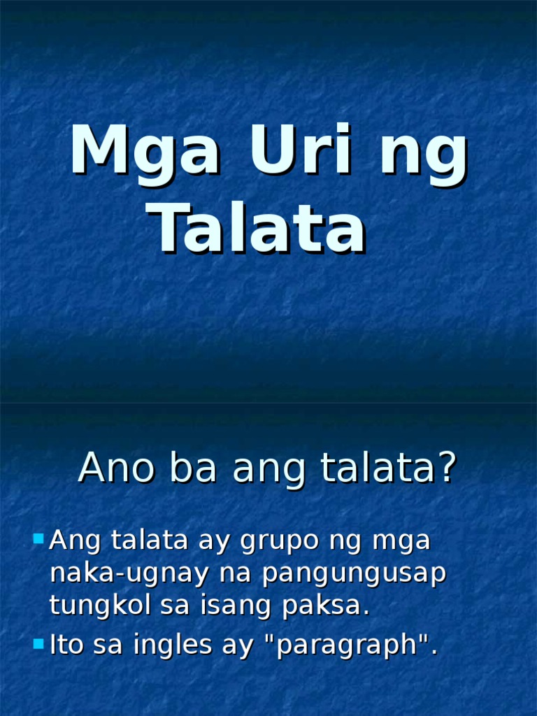Mga Halimbawa Ng Talata Paglalarawan Keywords. Talatang Naglalahad Talatang Nangangatwiran f Talatang Nagsasalaysay Nagkukwento nagsasaad kung kelan saan at paano ang mga nangyari. Sinukat sa gawaing ito ang limang sangkap ng batayang kasanayan sa pagsulat ang 1 Pagkakakabit-kabit ng Pagsulat 2 Wastong Kapitalisasyon 3 Wastong Pagbabantas 4 Wastong Pagbabaybay at 5 Kawastuhan sa Palugit at Kinis ng Pagsulat ng Talata.